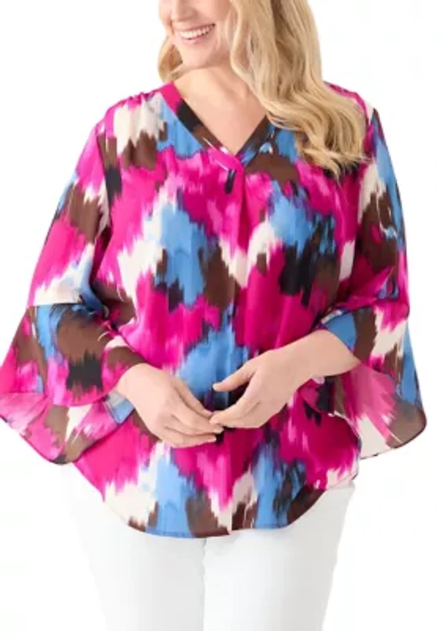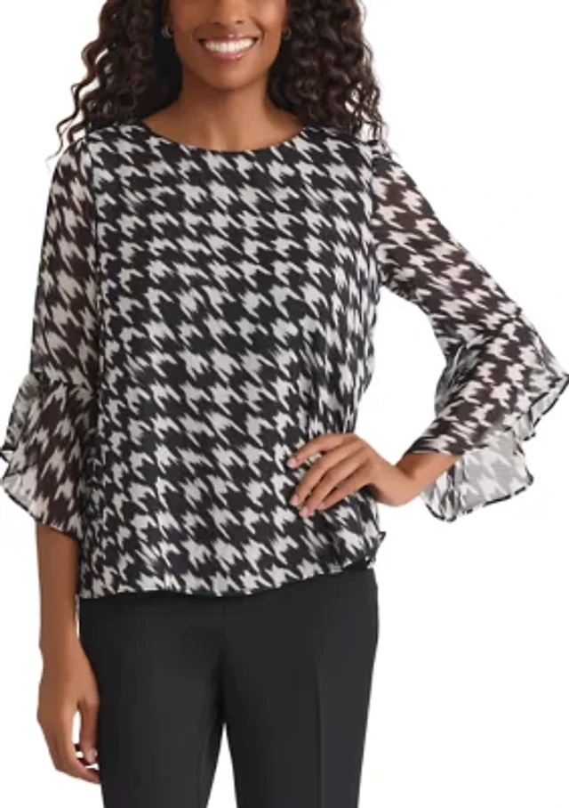 Petite Houndstooth Print Ruffle Sleeve Blouse