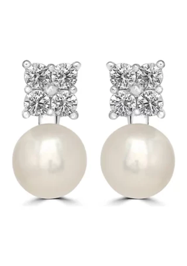 Child's Button Simulated Freshwater Pearl and Cubic Zirconia Frame Flower Stud Earrings in Sterling Silver