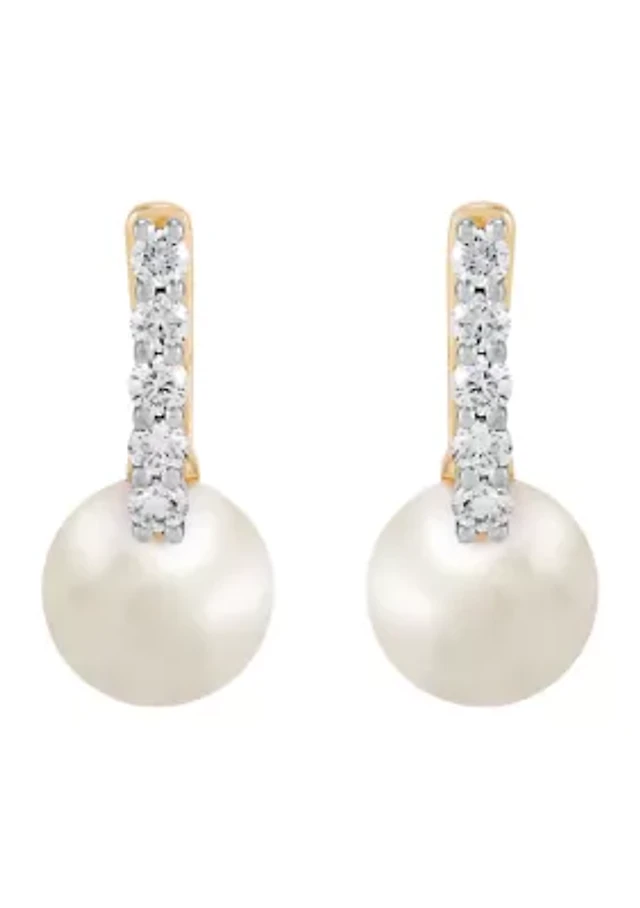 Pearl and White Topaz Hoop and Stud Earring Set in 10K Yellow Gold
