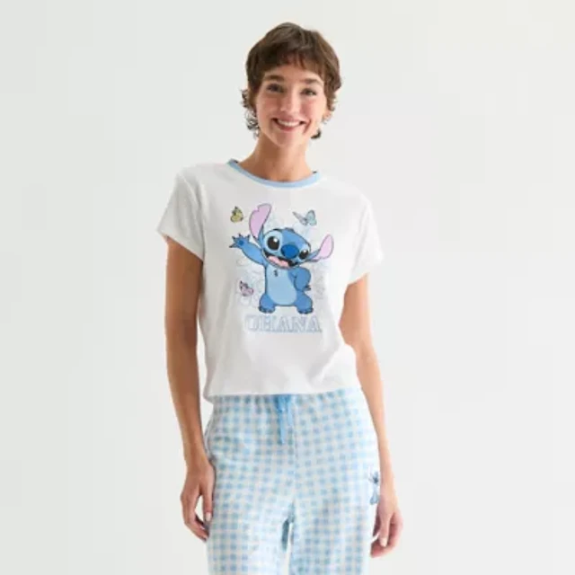 Stitch Pointelle Ringer Tee Womens Juniors Crew Neck Short Sleeve Fitted Lilo & Graphic T-Shirt