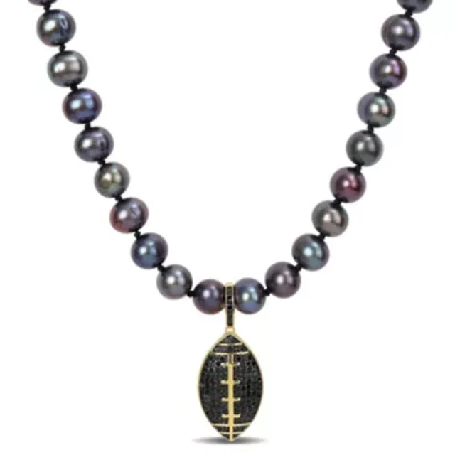 7-7.5mm Black Freshwater Cultured Pearl and 5/8 ct. t.w. Black Diamond Football Necklace in Yellow Plated Sterling Silver with Black Rhodium Plated