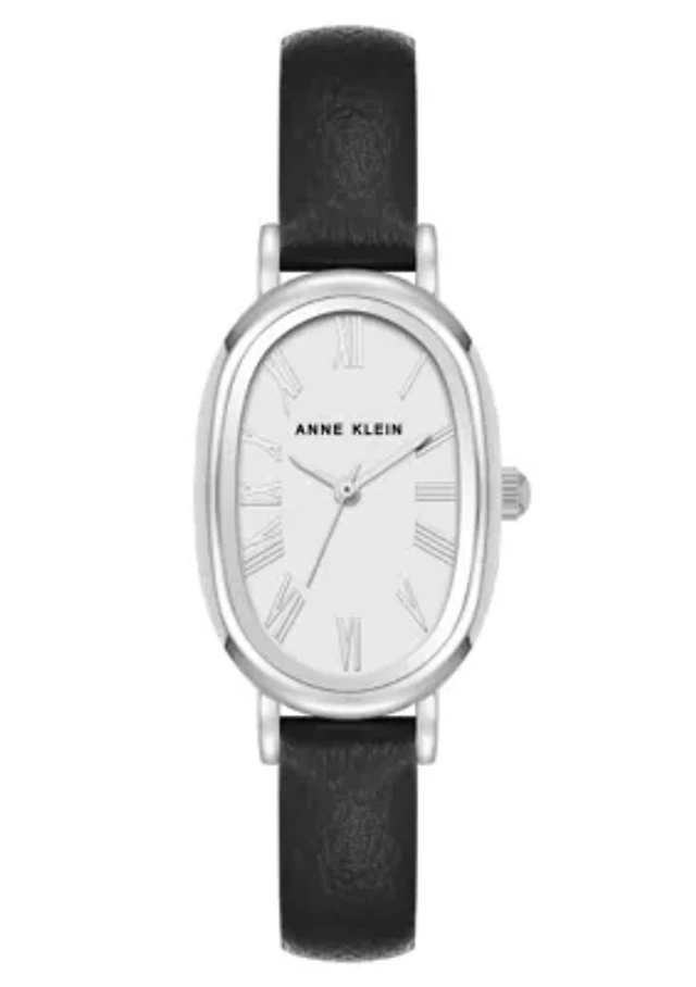 Anne Klein Women's Quartz Oval Black PU Leather and Silver-Tone Metal Alloy Watch, 23mm