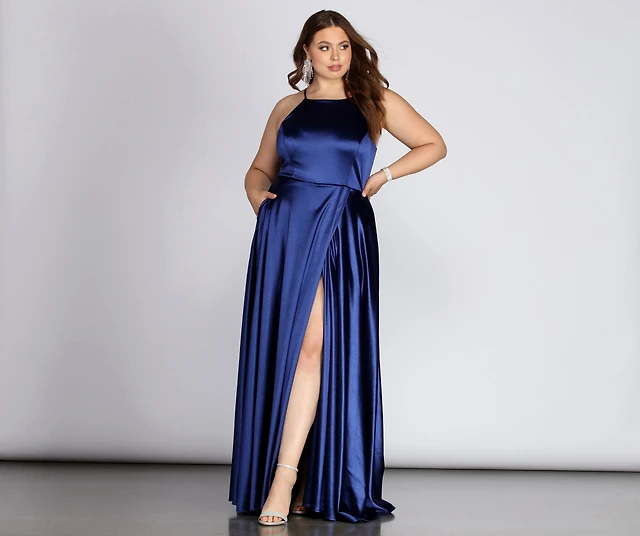 Hallie Rhinestone Satin High Slit Mermaid Dress