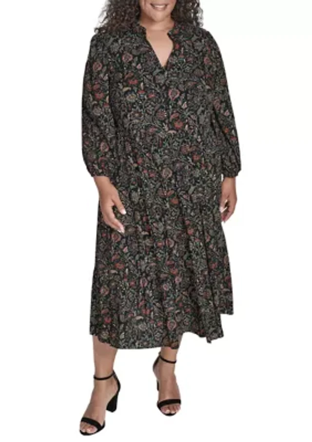 APNY Floral Print Spread Collar Long Sleeve Shirt Maxi Dress
