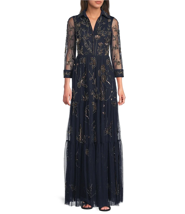 Adrianna Papell Floral Beaded Mesh 3/4 Sleeve Collared Shirt Dress Tiered Long Gown