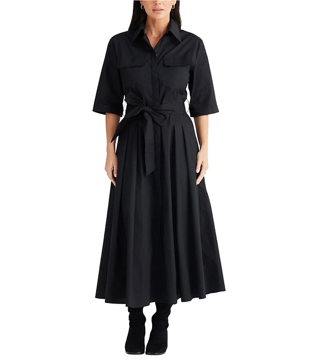 1. STATE Button Front Collared V-Neckline Long Sleeve Midi Shirt Dress