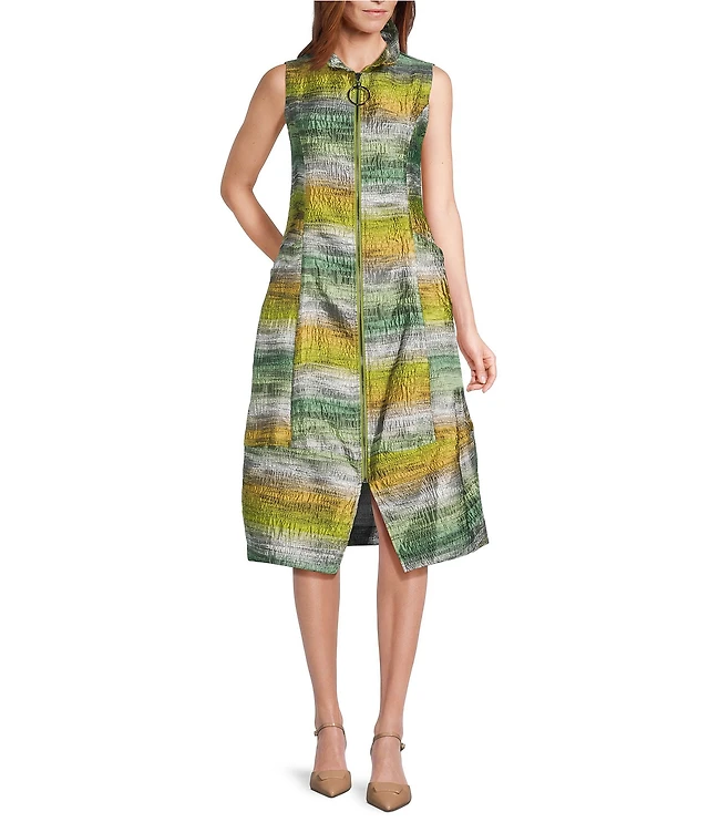 Ming Wang Cotton Stripe Mandarin Collar Zip Front 3/4 Sleeve Dress