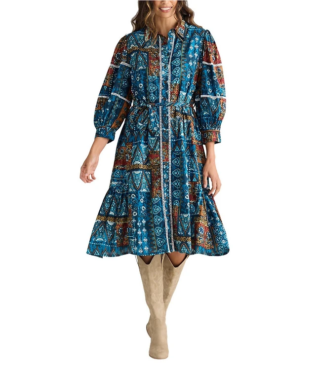 Reba Holiday Woven Cowboy Print Point Collar Long Sleeve Midi Shirt Dress