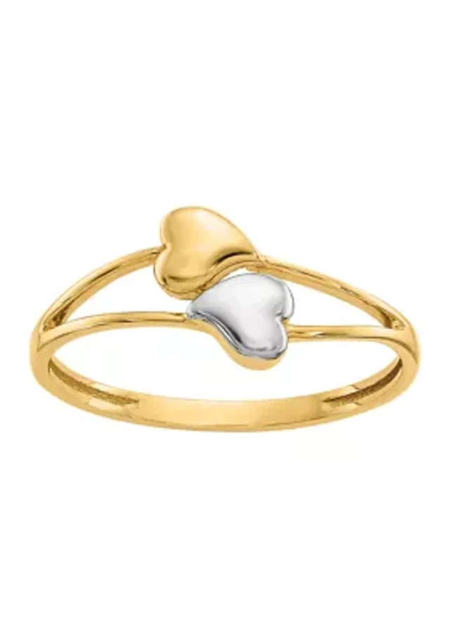14K Yellow Gold with White Rhodium Plating Double Heart Ring