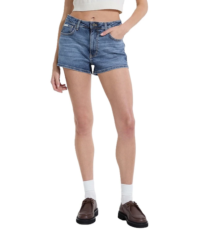 Petite Destructed High Rise Cut Off Denim Shorts in Authentic Dark Wash