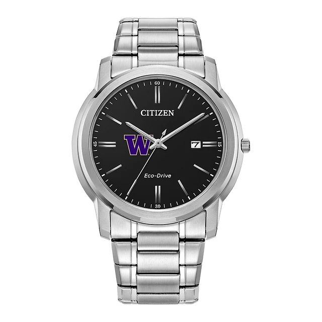 Men's Citizen Watch Silver Washington State Cougars Eco-Drive Black Dial Stainless Steel Watch
