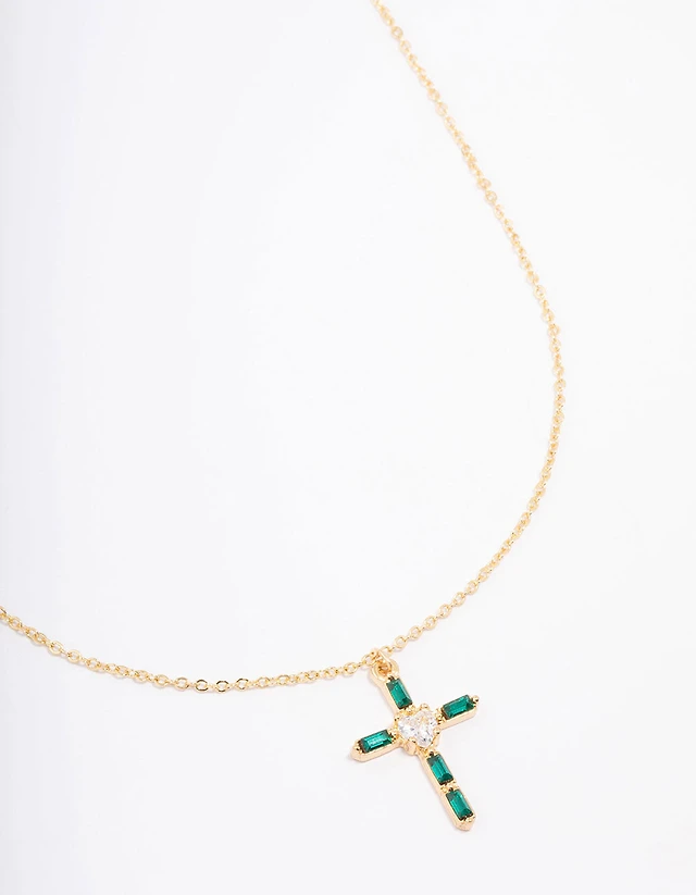 Gold Plated Emerald Cubic Zirconia Baguette Cross Pendant Necklace