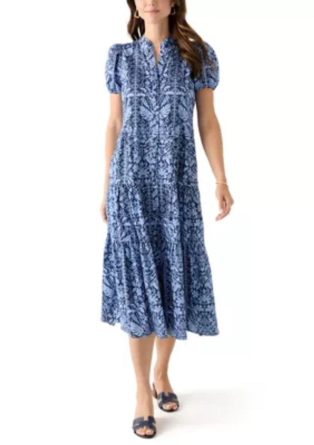 Women's Multi Floral Printed Split Neck Tiered Challis Dress