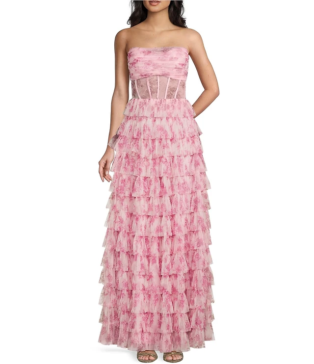 B. Darlin Floral Printed Mesh Strapless Corseted Tiered Ruffle Long Dress