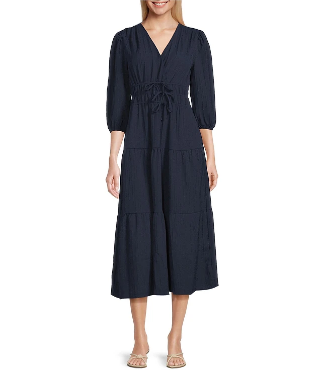 Leslie Fay Knit Jacquard 3/4 Sleeve V-Neck Tiered A-Line Tiered Midi Dress