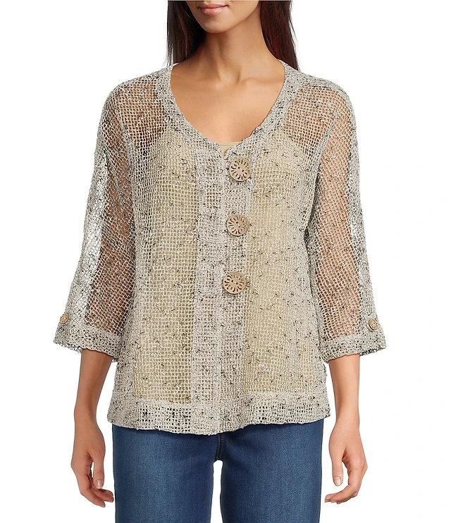 Ali Miles Woven Mesh Speckled V-Neck Elbow Length Sleeve Button Front Jacket