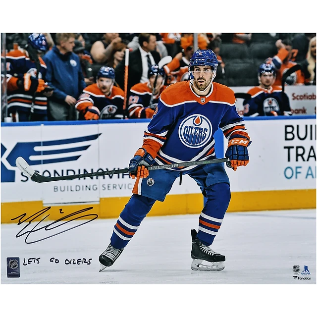 Zach Hyman Edmonton Oilers Autographed 16" x 20" Blue Jersey Celebrating Photograph with "Lets Go Oilers!" Inscription