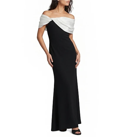 Betsy & Adam Long Scuba Crepe Dress With Taffeta Off The Shoulder Twist Top
