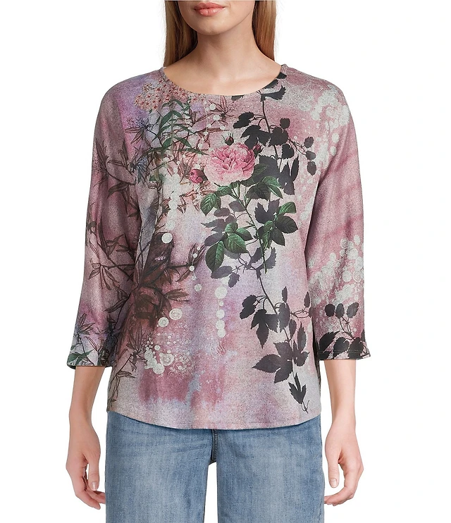 Leo & Nicole Hacci Knit Floral Fog Print Crew Neck 3/4 Dolman Sleeve Top