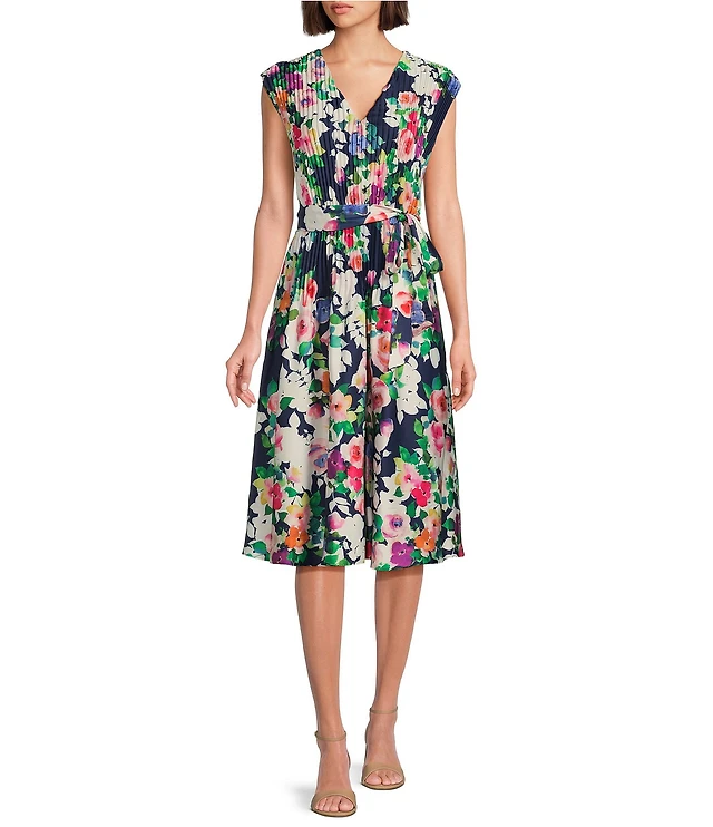Investments Scuba Crepe Floral Short Sleeve Fit and Flare V-Neck Midi Dress