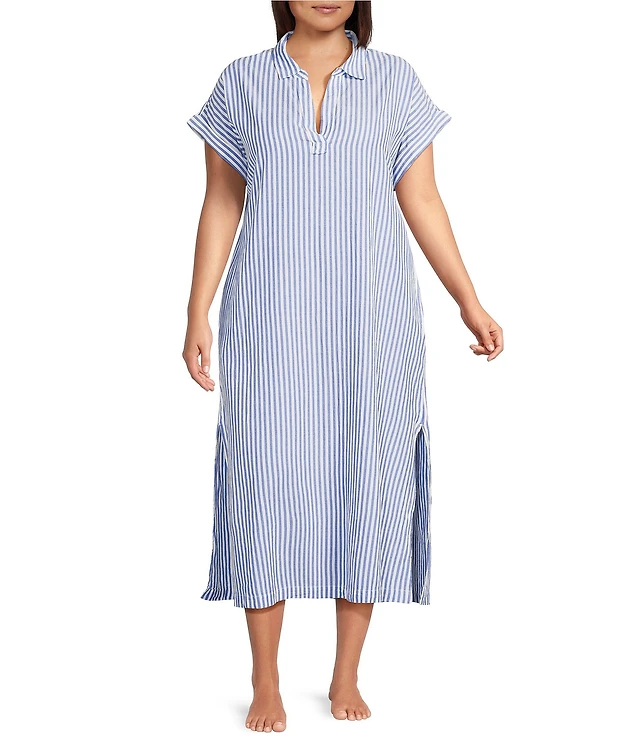 Kate Landry Plus Size Yarn Dye Woven Short Sleeve Split Collared Long Caftan