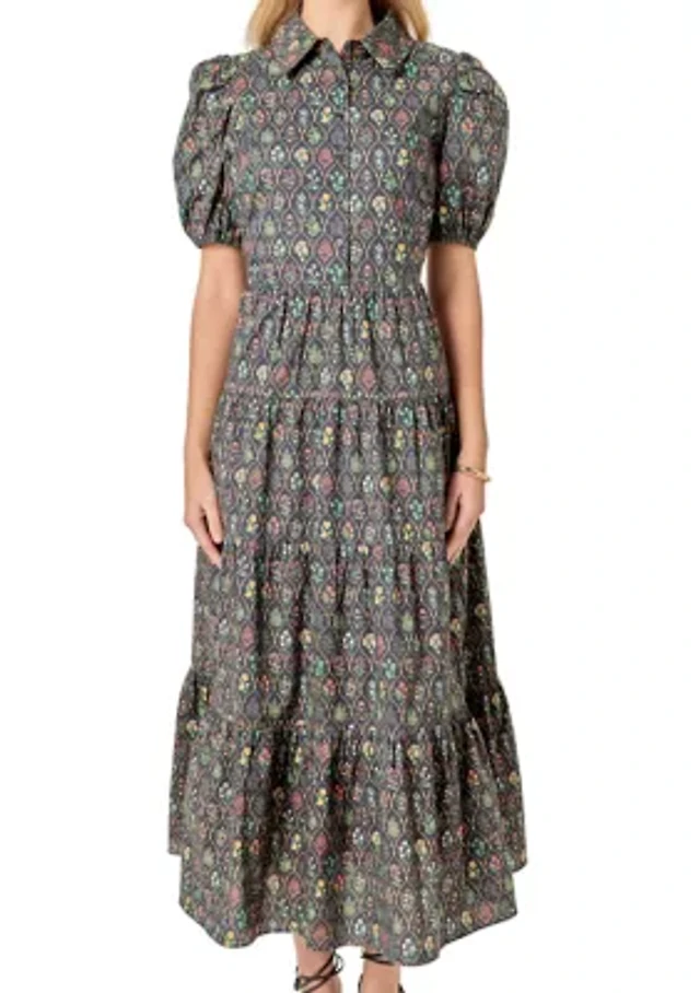 Honey and Rosie Sequin Floral Printed V-Neck Shirred Flared Hem Long Dress