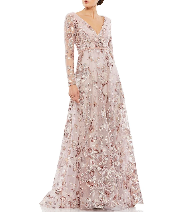 Mac Duggal Embellished V-Neck Embroidered Illusion Long Sleeve A-Line Gown