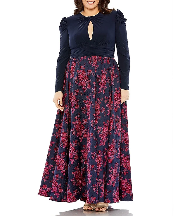 Mac Duggal Plus Size Long Sleeve Keyhole Knot Neck Floral Brocade Gown