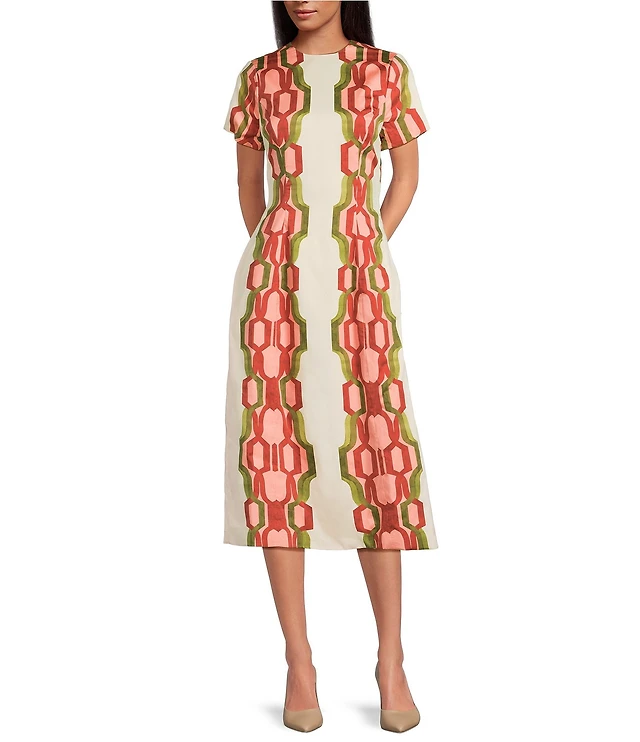 Ming Wang Bold Floral Jacquard Knit Round Neck Short Sleeve Sheath Dress