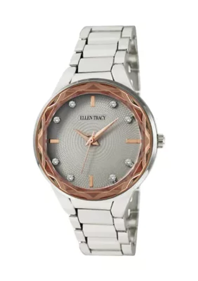 Silver Tone Rose Gold Faceted Bezel Crystal Accent Bracelet Watch