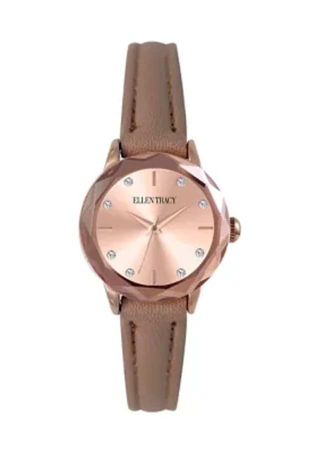 Rose Gold Tone Faceted Bezel Brown Strap Watch