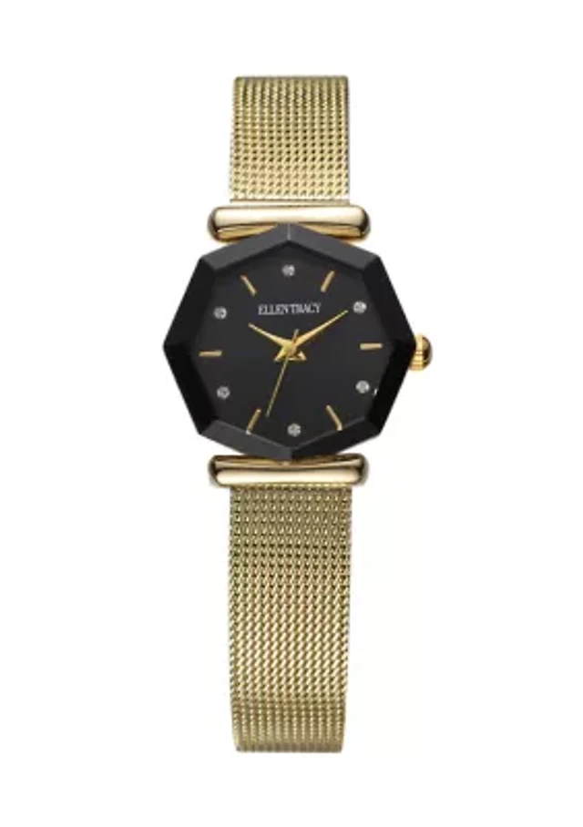 Gold Tone Black Faceted Bezel Mini Mesh Watch
