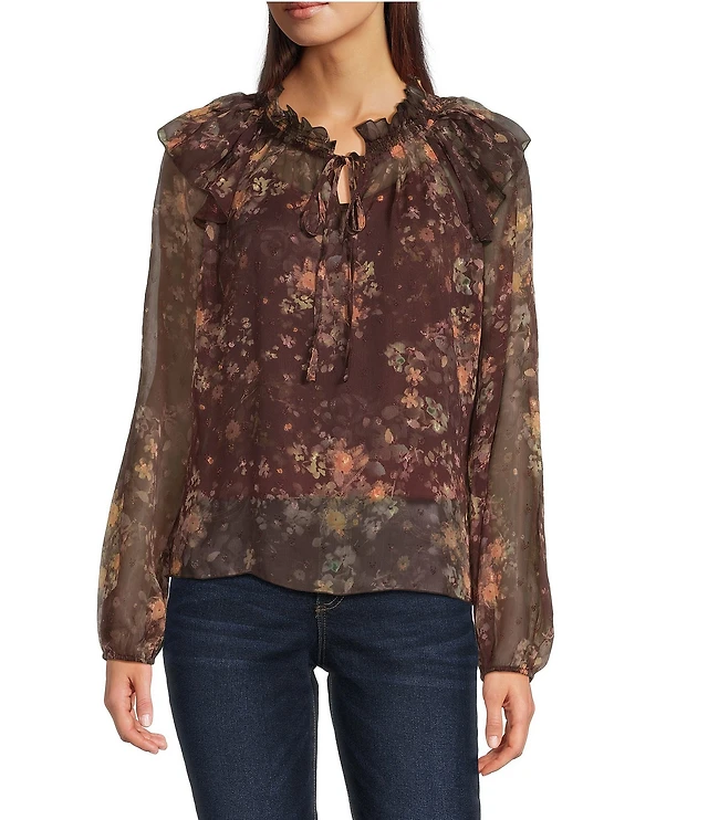Liverpool Los Angeles Crepe Georgette Floral Print V-Neck Tassel Tie Long Sleeve Blouse