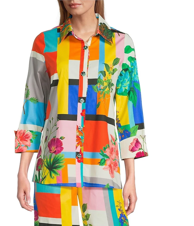 JOHNNY WAS Allbee Embroidered Floral Geometric Print Ruffle Banded Collar Long Sleeve Button Front Scallop Hem Blouse