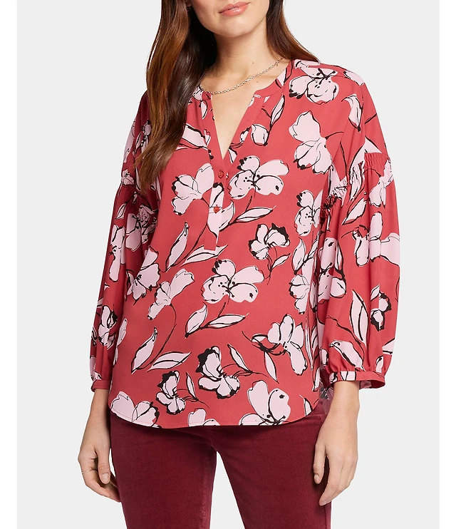 Liverpool Los Angeles Plus Size Embroidered Split V-Neck 3/4 Sleeve Button Front Blouse