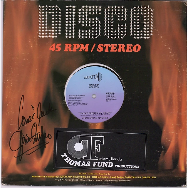 Gloria Estefan Autographed Gloria Estefan & The Miami Sound Machine Disco Single Album Cover With Love & Luck Inscription - PSA
