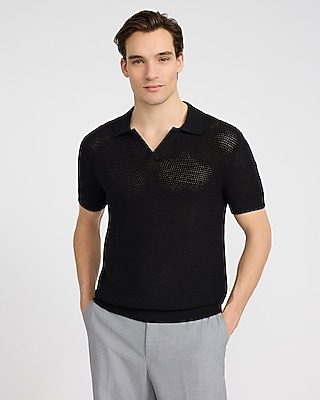 Cotton Open Knit Pointelle Johnny Collar Short Sleeve Sweater Polo
