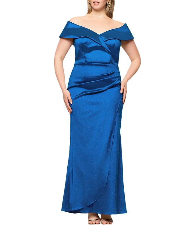 R & M Richards Plus Size Off-the-Shoulder Cap Sleeve Stretch Lace Mermaid Gown
