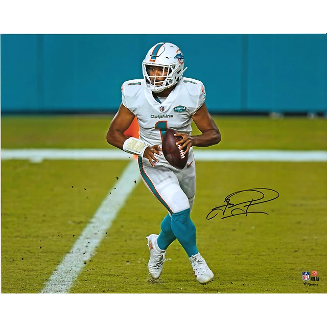 Tua Tagovailoa Miami Dolphins Framed Autographed 16" x 20" White Jersey Rolling Out Photograph