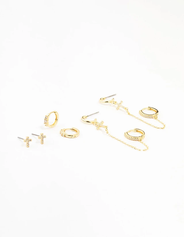 Gold Plated Brass Cross Stud & Chain Earrings 4-Pack