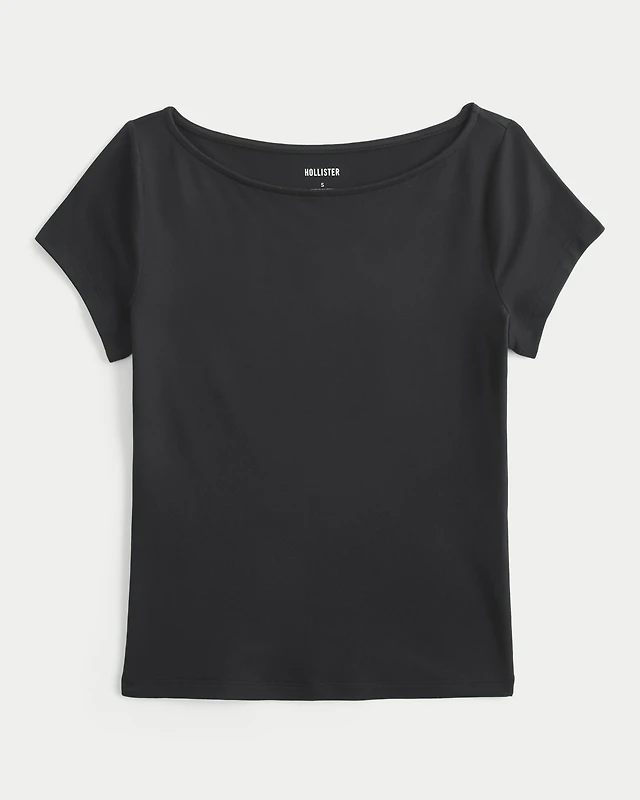 Fitted Ribbed Shine Scoop Neck Elbow Sleeve Tee