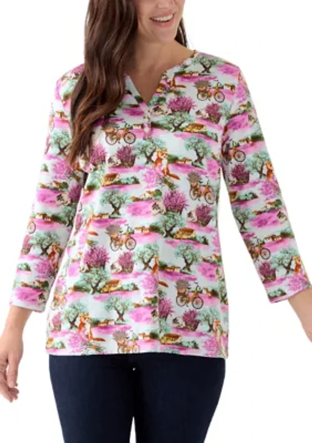 Women's 3/4 Sleeve Printed Henley Shirt