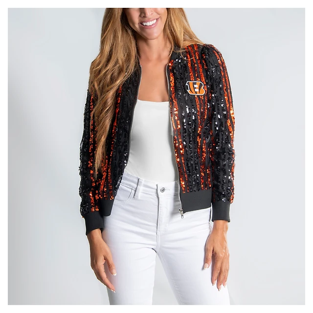 Women's Cuce Black Cincinnati Bengals Slim Fit Sequin Striped Full-Zip Bomber Jacket