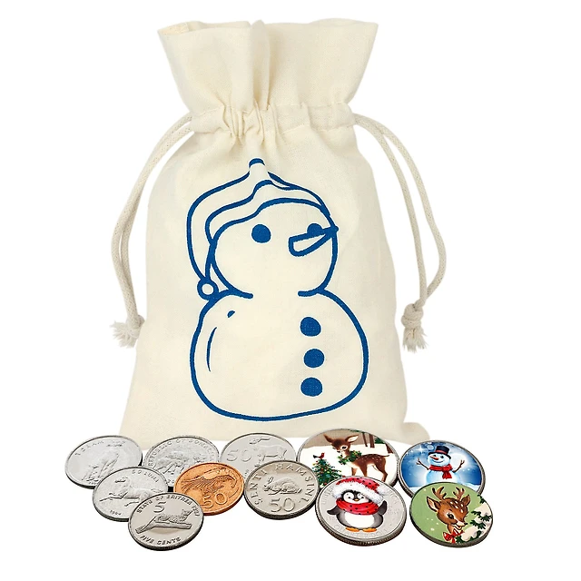 Animal Coins From Around The World And Colorized Christmas Coins In Snowman Canvas Bag