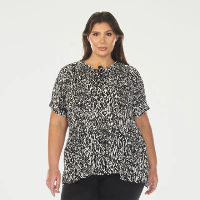 White Mark Printed Womens Plus Split Tie Neck Short Sleeve Peplum Top