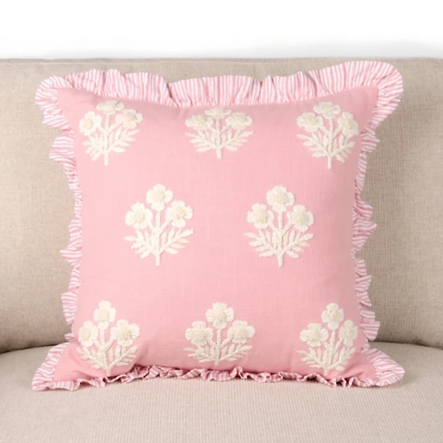 Cream Embroidered Floral Outdoor Lumbar Pillow