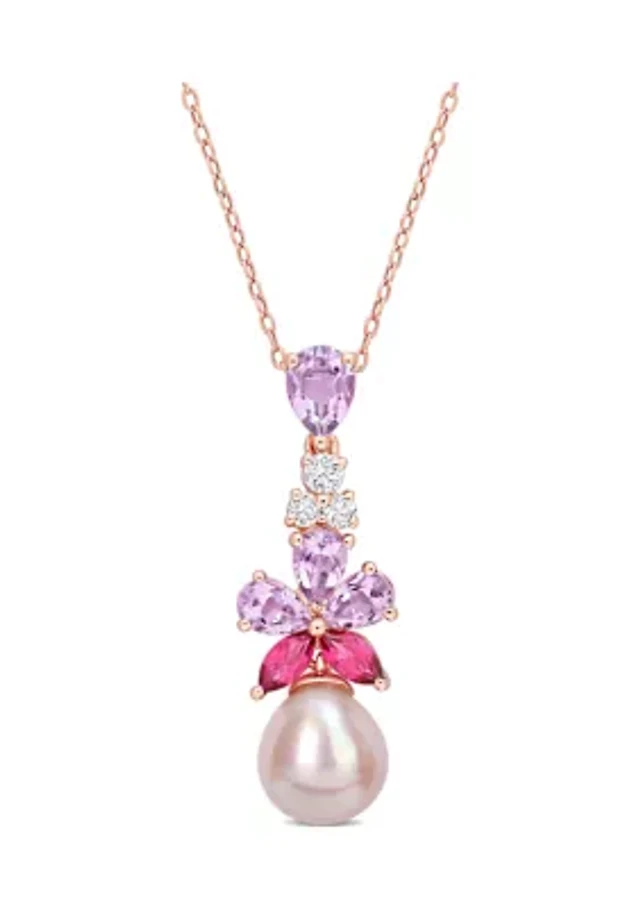 2-Piece Set of 8.5-10MM Pink Freshwater Cultured Pearl and 4.82 ct. t.g.w. Rose De France, Pink and White Topaz Earrings and Pendant with Chain in 18K Rose Gold Plated Sterling Silver
