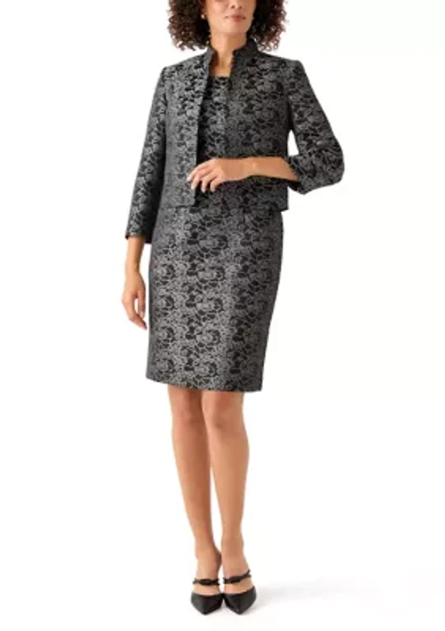 Jacquard Stand Collar Three Quarter Sleeve Jacket & Empire Seamed Dress