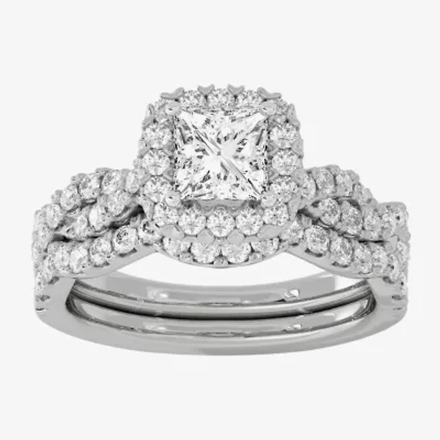 H-I / Si1-Si2) Womens / CT. T.W. Lab Grown White Diamond 10K Gold Cushion Side Stone Halo Bridal Set