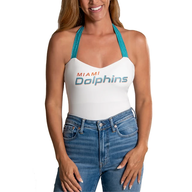 Women's Cuce White Miami Dolphins Rhinestone Semi-Cropped Halter Tank